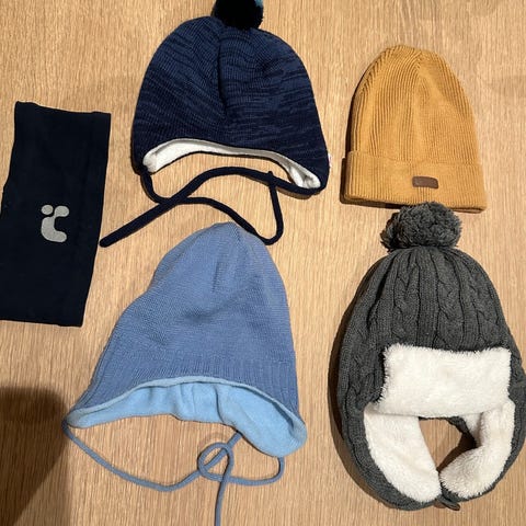 Helseteppe, babylue, tøfler (trolig til barn 1 år), hjemmestrikkede votter i strl 1 år 😊