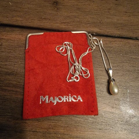 Nydelig sett bestående av halssmykke og armbånd m sølvbelagt lås og syntetiske perler. (mulig Majorica- perler) Perfekt stand.