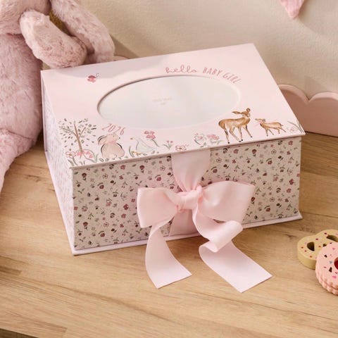 Helt ny og ubrukt blå minneboks for baby født i 2026. Inneholder små esker til oppbevaring av f. eks første sokk, første hårlokk osv.