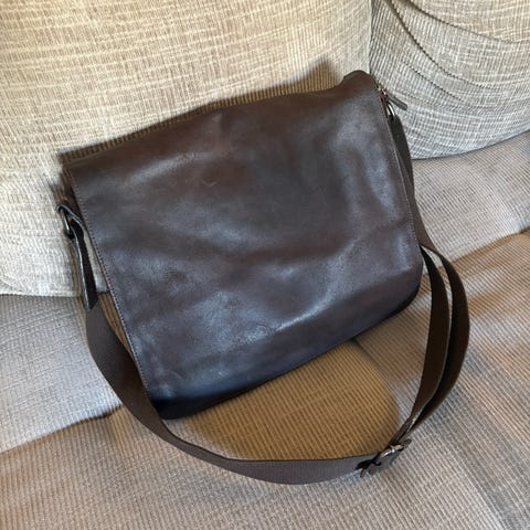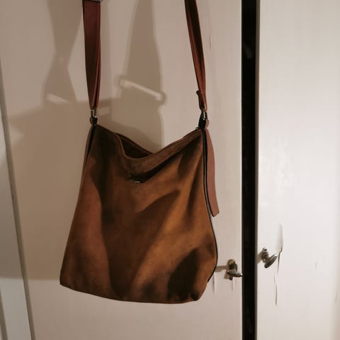 Nydelig brun væske selges. Brukt kun et par ganger til å ha PC-en i. Vesken er laget i skinnimmitasjon og har en justerbar skulderrem. Den har et enkelt og funksjonelt design som egner seg til daglig bruk. Har og justerbart håndtak se bilder.