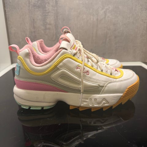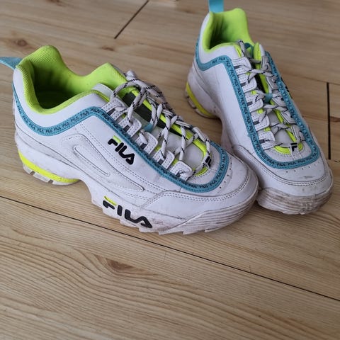 Selger Fila Sneakers i størrelse 39. Skoene har en kombinasjon av hvit, blå og gul farge. Skoene er høye og komfortable å gå i. De passer fint til alle aldre.