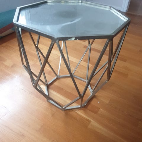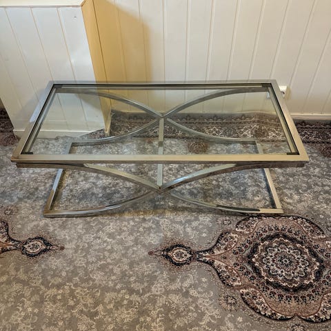 Rundt glassbord med ramme i metall. Bordet har en gjennomsiktig glassplate og en kryssformet metallramme som støtte. Passer som sidebord i stue eller lignende oppholdsrom.