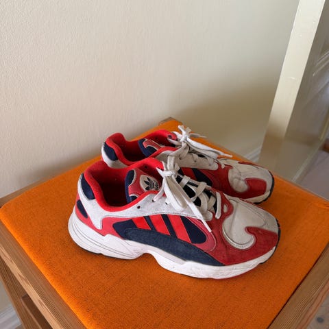Selger et par Adidas Yung-1 i rød/blå/grå fargekombinasjon.