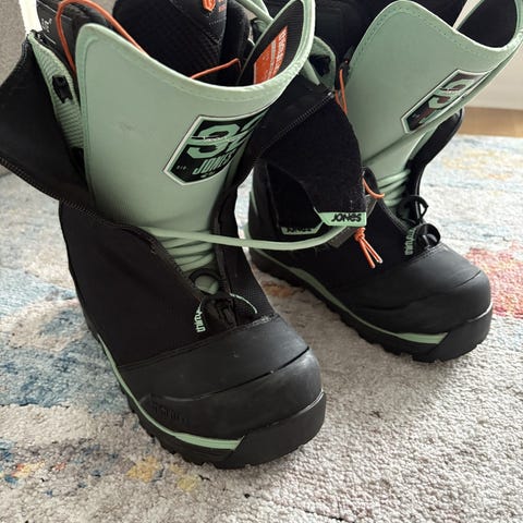 BD snowboardstøvler i størrelse 37, svart farge. Yttersåle 30 cm. Støvlene er designet for bruk ved snøbrettkjøring og har dobbel snøring for justering.