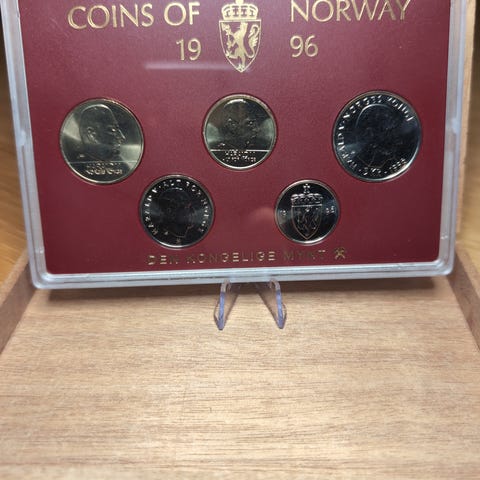 Norges myntsett fra 1999 med flere mynter i ulike valører. Myntsettet er oppbevart i en original innramming med norsk tekst og symboler. Mynter inkluderer blant annet 20 kroner med kongelig emblem og andre mynter med nasjonale motiver.