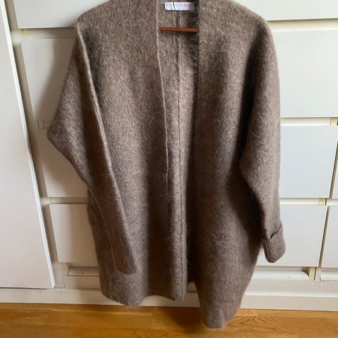Cathrine Hammel cardigan i størrelse M, laget av en blanding av 30% angoraull og 70% nylon. Cardiganen har en beige farge og er designet for kvinner.