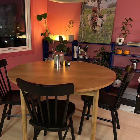 Nydelig rundt bord i hvitpigmentert eikefiner, skandinavisk stil som passer godt i liten leilighet. Subtile bruksmerker. Ingen hakk. Sist oljet i sommer som ga litt sjatteringer i noen lys. Nytt i 2020.