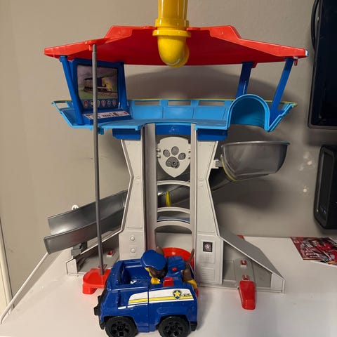Paw Patrol lekestasjon med flere figurer og kjøretøy. Leketårnet har en stor sklie og flere nivåer for lek. Passer for barn som liker Paw Patrol-serien.