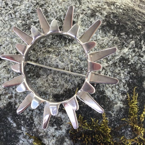 Flott brosje i sølv og med sten, designet av Tone Vigeland for Norway Design. Den måler 5,5 x 4,5 cm og stenen er hel og uten sprekker.