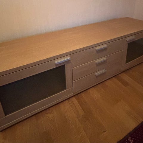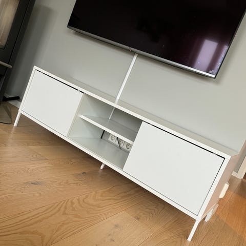 TV-bord selges pga ønske om overgang til et større TV-bord. Den er i hvit høyglans og passer veldig godt inn i de fleste rom. Den er i god stand og pent brukt, men vanlige bruksmerker må medregnes da denne er brukt i noen år. Den har to skuffer som gjør det veldig enkelt å oppbevare ting. TV-bordet ble kjøpt på Jysk for noen år siden.