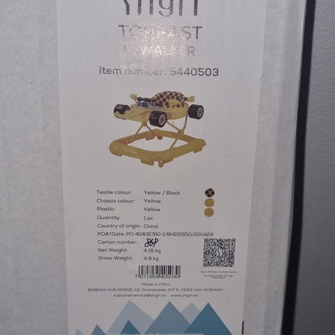 Yngri Torfast gåstol i gul farge. Designet for barn som trenger støtte under læring av gange. Laget i holdbart materiale for stabilitet og sikkerhet.