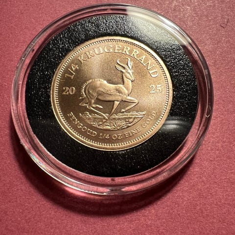 South Africa Krugerrand sølvmynt med vekt på 1 oz. Mynten har motiv av en springbukk på forsiden og et portrett av Paul Kruger på baksiden. Produsert i sølv.