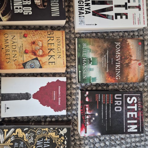 Bokpakke med krim- og spenningsromaner av ulike forfattere. Blant bøkene som vises på bildene er titler av Tom Kristensen, Stephen King, Wilbur Smith, Dan Brown, John Grisham, Anne B. Ragde og flere. Bøkene er innbundet og i pocketutgave i blanding, og egner seg for lesere som ønsker en samling krim og spenning i bokhyllen. Antall titler og eksakte utgaver fremgår av bildene.