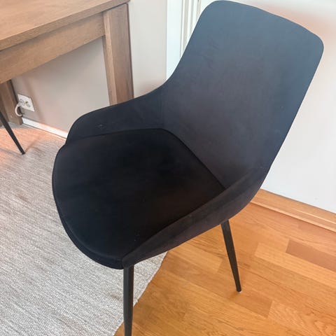 Selger 6 elegante svarte stoler i myk velour, med komfortable armlener og et tidløst uttrykk. Stolene gir et sofistikert preg til spiseplassen og kombinerer både stil og god sittekomfort.