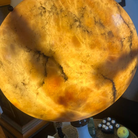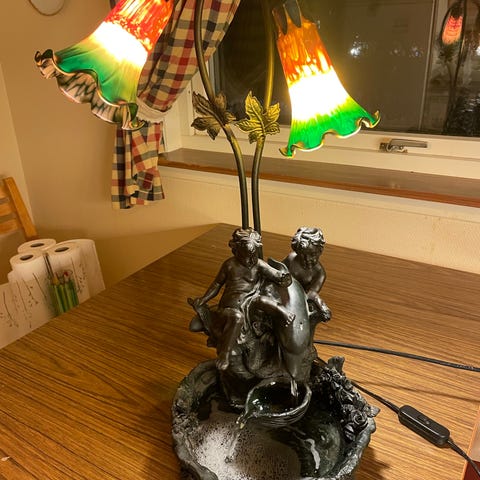 Selger denne Art nouveau lampen i frostet grønt glass og "patinert" messing sokkel. Snortrekk bryter virker ikke og bør repareres / byttes. Høyde 46 cm, diameter skjerm 22 cm