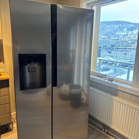LG Side-by-Side kjøleskap i rustfritt stål. Kjøleskapet har to dører med separat fryser og kjøledel, og er utstyrt med is- og vanndispenser.