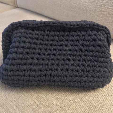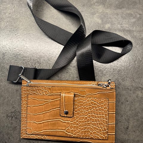 Clutch veske laget av bomull i brun farge. Vesken har et håndtak og en kompakt størrelse som gjør den egnet til daglig bruk for kvinner.