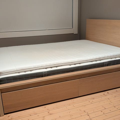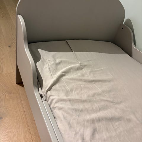 IKEA loftseng i tre med hvite detaljer. Sengen har en trapp på siden og sikkerhetsrekkverk rundt øvre seng. Passer for barn og kan brukes til å frigjøre gulvplass under sengen, for eksempel til lek eller oppbevaring. Sengen kan vendes opp ned og fungerer like bra.