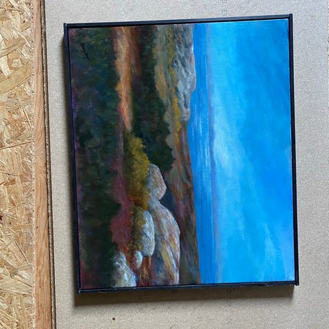 Maleri som viser et landskap med høstfarger, inkludert trær og fjell i bakgrunnen. Bildet har varme farger og en naturlig stemning.