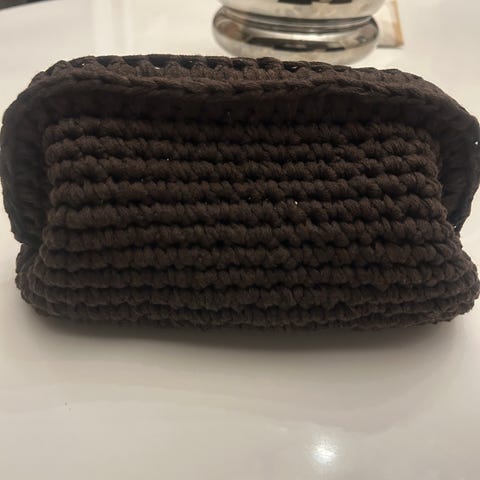 Vesken har en håndlaget struktur med et åpent rom for oppbevaring. Fargen er jeansblå, og designet er enkelt og funksjonelt.