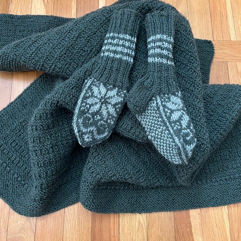 Nytt hjemmestrikket lyseblått babyteppe, strikket i babyull, ca. 70x70 cm.