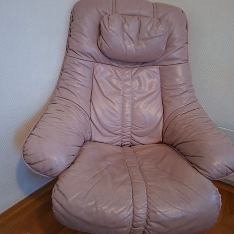 Fin stol i rødbrunt ulltrekk og tre.