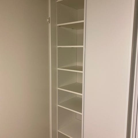 Flotte og store skyvedører til et garderobeskap for eks garderobeskap selges for å gi plass til en seng. God plass for oppbevaring og gjemme rot. Bunn og toppskinne følger med samt en endeplate.