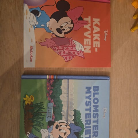 Disney Mikke og Minni barnebøker med titler som 'Mikke på strandtur', 'Minni på sporet' og 'Flyplassen'. Bøkene er illustrert og egnet for barn.