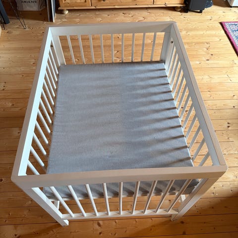 Lekegrind selges. Kan justeres i 3 høyder. Madrass kan følge med.