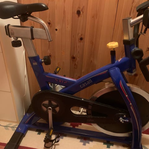 Trimsykkel med stålramme i sølv/svart farge. Utstyrt med justerbart sete og styre for tilpasning. Vanlige sykkelpedaler. Egnet for innendørs trening.