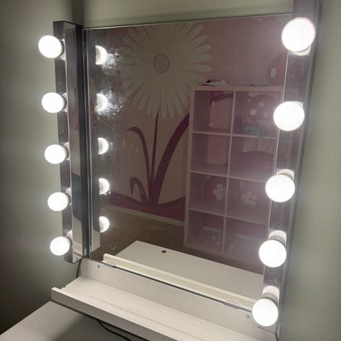 Brukt som sminkespeil over sminkebor på ett ungdomsrom.