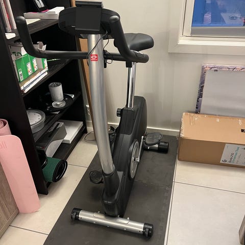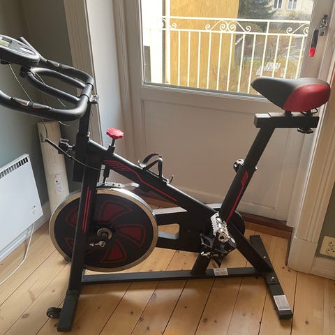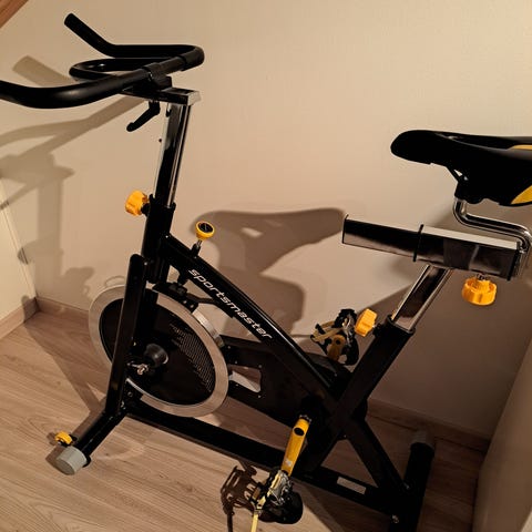 Maxfit Trimsykkel stasjonær treningssykkel med justerbart sete. Sykkelen har et justeringshjul for motstandsnivå og er designet for innendørs trening.
