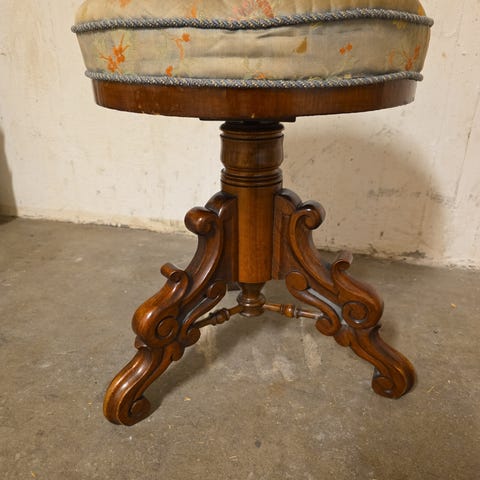 Nydelig, gammel krakk/pianokrakk i mørkt treverk med brodert trekk.