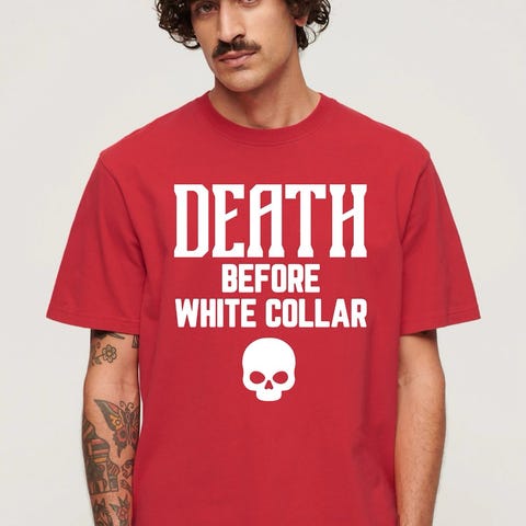 Disse har jeg designet selv. Det er en tribute til fonten Old English. Jeg har dem i L og XL. Lite opplag. Det er silketrykk.