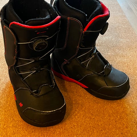 K2 Vandal snowboardstøvler i svart og oransje farge, størrelse EUR 35,5 (US 4K). Designet med Boa-lukkemekanisme for enkel justering og god passform.