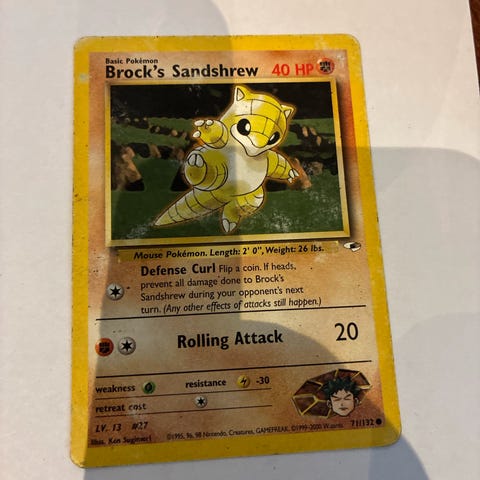 TV4 Brock Pokémon samlekort med bilde av karakteren Brock. Kortet har en TV4-logo og viser Brock med blå hansker. Kortet har tegn på bruk og er en del av Pokémon-serien.