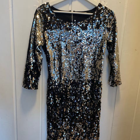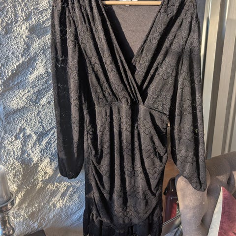 Bik Bok festkjole i størrelse L for dame. Kjolen er beige og laget av polyester. Den har et design tilpasset formelle anledninger.står veldig fint på. Glidelås bak i ryggen