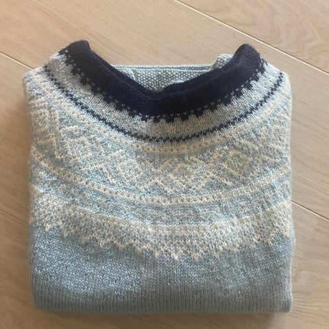 Nydelig genser selges da denne ved en feil ble vasket med litt for hard sentrifuge og nå passer en XS. Dette er nydelig hjemmestrikk i god kvalitet. På lappen bak står det "Beritstrikk". Denne kan passe store barn, ungdom eller XS.