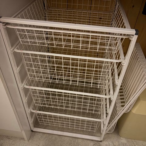 Oppbevaringskombinasjon med 6 stråkurver til klær. Har to stk i denne størrelsen som selges for 450 kr per stk.