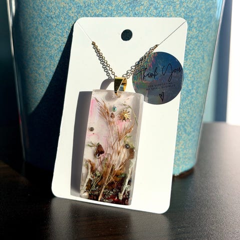 Halskjede i gullfarget, rustfritt stål med rektangelformet håndlaget anheng i resin. Anhenget inneholder tørkede planter og blomster.
