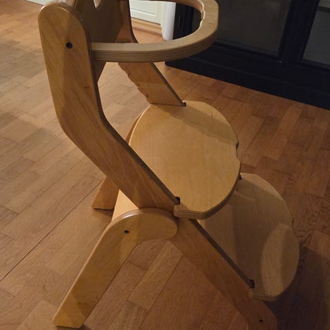 Stødig stol, der trinn kan stilles etter hvert som barnet vokser, noen bruksmerker. Følger med bøyle og seler.