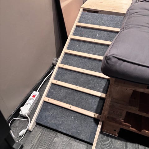 Tre rampe med teppe på overflaten. Rampen har en skråning og er støttet av fire ben. Materialet er tre, og teppet er grått. Kan brukes til å hjelpe kjæledyr med å komme opp i høyere områder som sofa eller seng.
