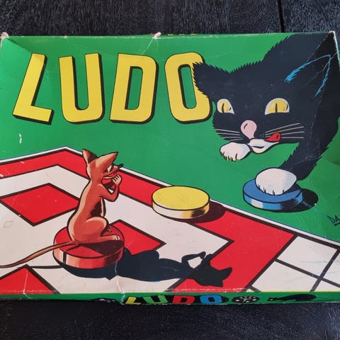 Original Ludo brettspill med fargerike spillebrikker og terning. Spillet leveres i en rød eske med illustrasjon av en katt og spillbrikker. Passer for flere spillere og egnet for familie- og sosiale spilløkter.