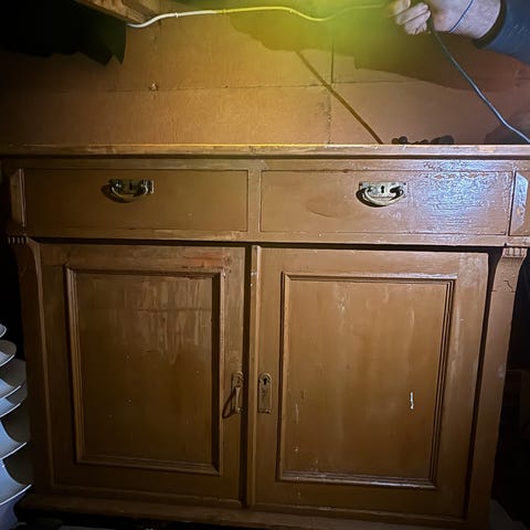 Nydelig antikk skap i tre. Skapet har to skuffer og to dører, med et overskap som har glassdører og en åpen hylle i midten.