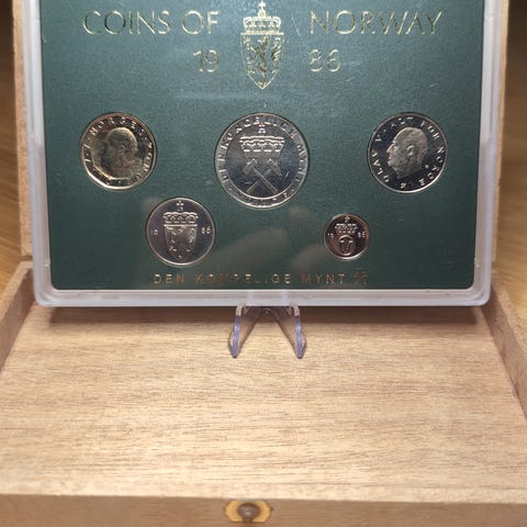 AB Tumba Bruk Mynter Sett Sverige 1929 inneholder ubrukte, vanlige mynter preget og pakket i en samling. Settet inkluderer mynter med forskjellige valører som 10 kroner, 5 kroner, 1 krone, samt andre designermynter. Myntene er produsert med spesifikasjoner som vekt og metallinnhold, og presenteres på en bakgrunn med historiske bilder av Stockholms slott og tilhørende informasjon.