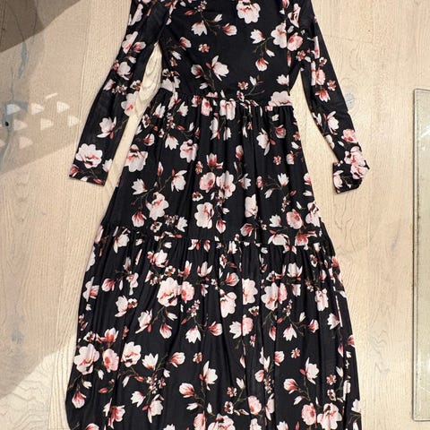 Selger blomstret midikjole fra Donna kjøpt på Match i str 36. Kjolen er fôret, med unntak av ermer. Åpning i halsen med en knapp øverst.
