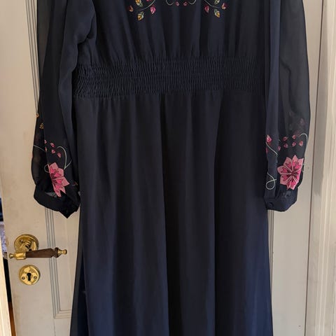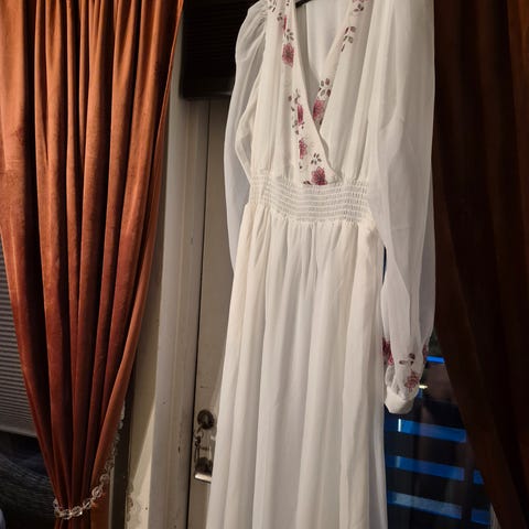Pen kjole til 17.mai, konfirmasjon eller andre spesielle anledninger. Denne kjolen har noen tråder som er trekt ut. Det vises kun hvis du er nær kjolen. Kjolen er kun brukt en kveld når vi feiret bryllupet vårt.