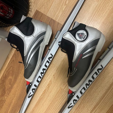 Fischer langrennsski med tilhørende staver. Skiene i god stand 184cm ,staver 135cm og sko eu 38-39 skoene har to små slitasjehull på innsiden ved hælene, men det påvirker ikke komforten.
