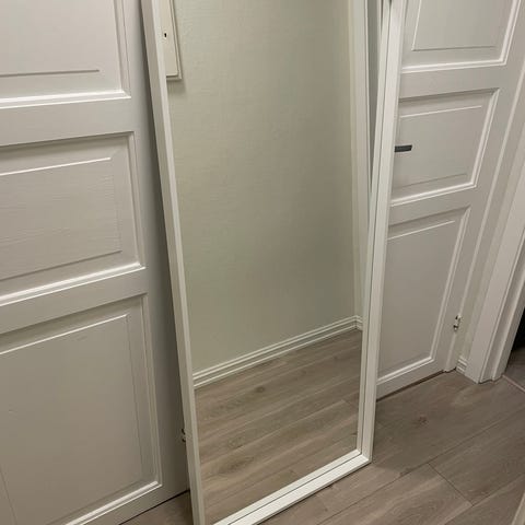 IKEA NISSEDAL speil med svart ramme. Speilet har et rektangulært design og kan brukes til å reflektere lys og gi rommet et større inntrykk. Passer for montering på vegg i ulike rom som stue, soverom eller gang.