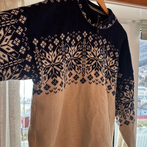 Dette er en klassisk og tidløs ullgenser fra Dale of Norway, designet og strikket i Norge av norsk ull. Genseren har det ikoniske Cortina-mønsteret med historiske røtter fra OL i 1956, og holder svært høy kvalitet.